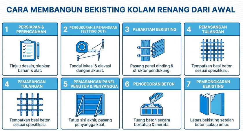 Tahap awal adalah persiapan matang setelah desain kolam renang disetujui dan area galian tanah selesai diratakan. Semua bahan bekisting seperti papan, balok kayu, dan plywood disiapkan. Perencanaan ini mencakup perhitungan material agar tepat guna dan proses pemasangan bisa efisien, berpedoman pada gambar kerja teknis.