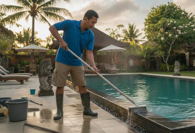 Setiap kali kolam tidak digunakan, pasang penutup agar daun dan debu tidak masuk. Gunakan jaring penyaring manual untuk membersihkan permukaan air dari kotoran ringan setiap pagi.